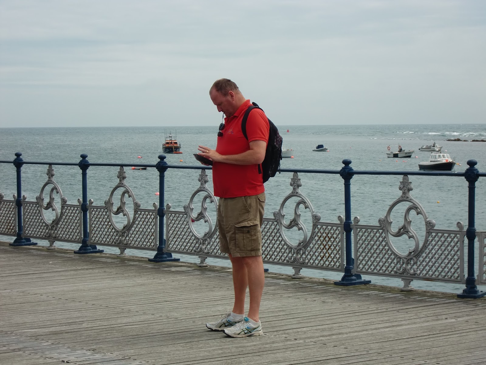 Del discovering he had a phone signal at the end of Swanage Pier!
